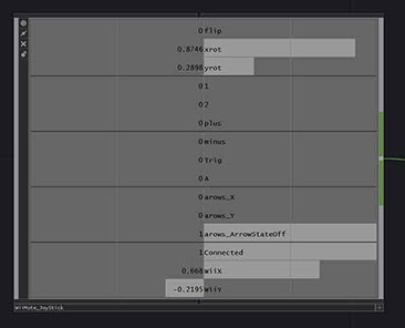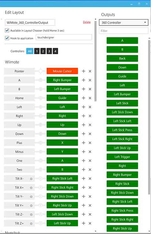 In Touchmote you need to map your Wii buttons with the Xbox 360 buttons so they can read as a joystick in TouchDesigner. There is an "Outputs" box to the right that you can set to 360 Controller then just drag and drop the corresponding buttons to work. An image of what you need to set up to make the .tox I provided work well is at the bottom of this description.