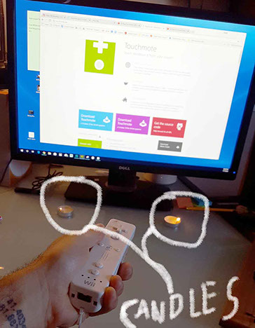The last big thing is that to use the WiiMote to point at things, it has to be set to the Mouse Cursor, but without a sensor bar, you can't get it to work. I picked up a cheap $10 wireless sensor bar at GameStop, but thing is, the sensor bar is just a bunch of Infrared Sensors, nothing more. You can actually use candles placed at either side of your screen and it works just the same (really well actually) because the WiiMote sensor picks up the heat signature from the candles. The next project I did was using candles being moved around with the WiiMote in place, which was pretty rad. There's a picture of how you might set up candles as sensors to the right.
